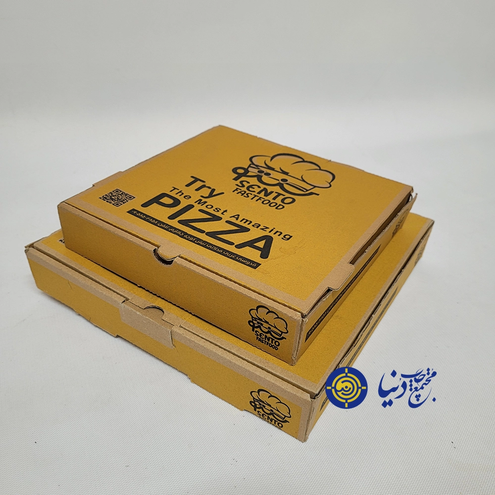 - جعبه پیتزا در سایزهای متنوع (۲۰ تا ۳۶ سانتیمتر) ساختهشده از مقوای کرافت بهداشتی و کارتن ای فلوت بهداشتی، با قابلیت چاپ از بدون چاپ تا چهاررنگ.